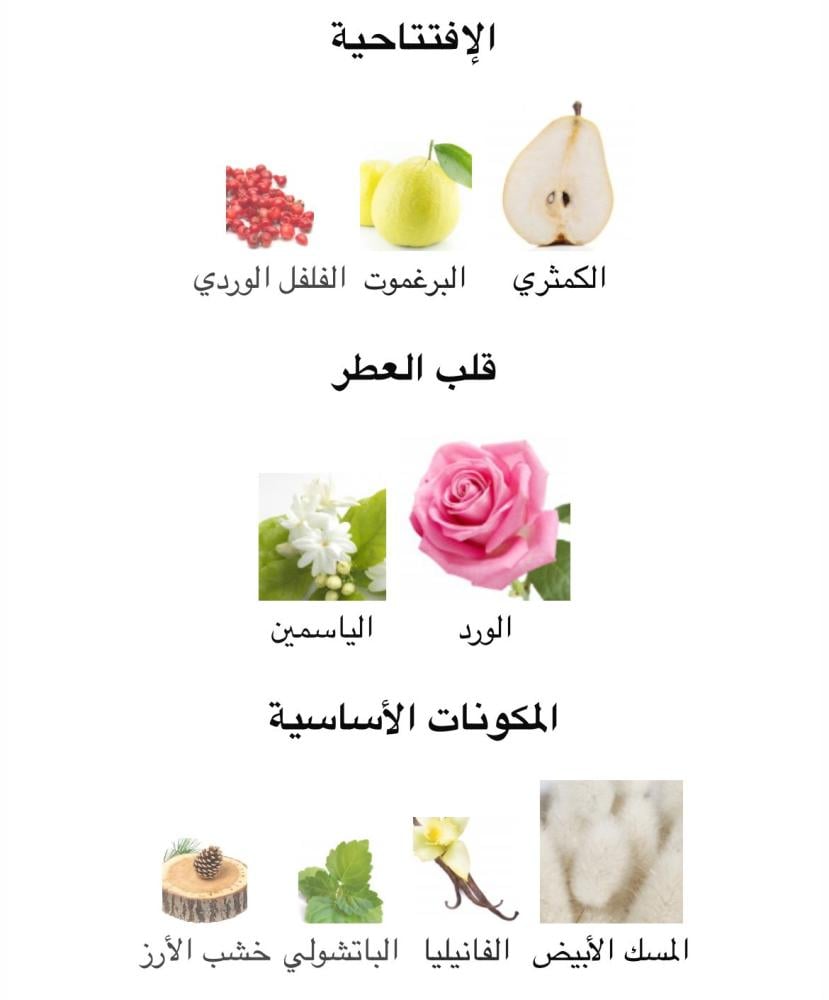 اس کے دل میں، گلاب اور چمیلی نازک طور پر کھلتے ہیں، سفید کستوری کو گلے لگاتے ہیں جو گہرائی اور گرمی کو بڑھاتا ہے۔